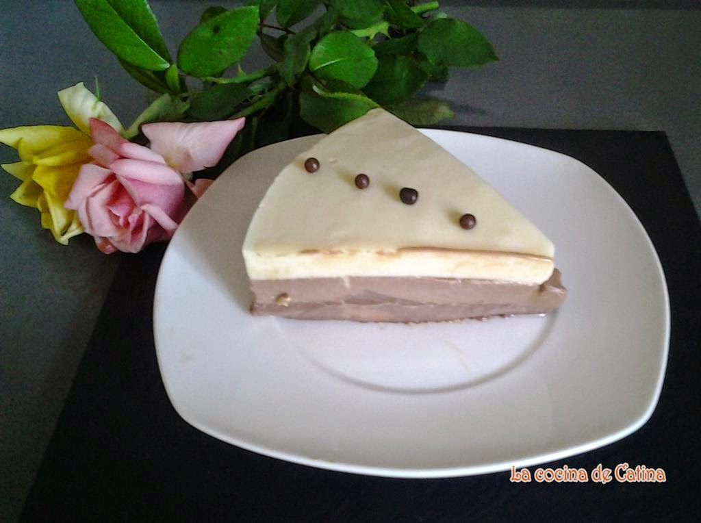 Echar en el vaso el chocolate con leche, triturar unos segundos en vel. 5/10. Añadir el sobre de cuajada, 30 gr de azúcar y 500 ml de la mezcla reservada. Programar 8 min a 90 grados vel. 5 y cuando acabe, rayar un poco la superficie anterior y volcar encima esta mezcla. Lavar el vaso. Echar el chocolate blanco y triturarlo unos segundos en velocidad 5/10. Añadir el sobre de cuajada, 30 gr de azúcar y el resto de la mezcla reservada. Programar 8 min, 90 grados vel. 5 y cuando acabe, rayar un poco la superficie anterior y volcar encima de ella. Dejar enfriar y meter en el frigorífico.